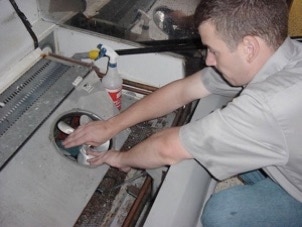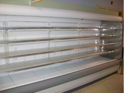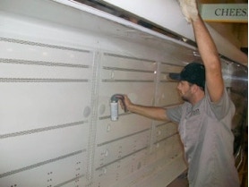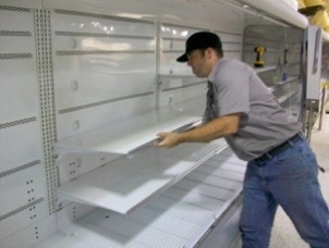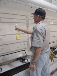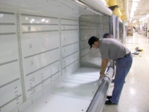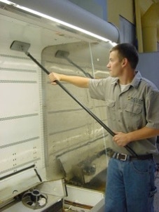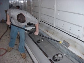 Shelves, wire racks, bottom pans, and return air grilles are pressure washed outside to renew them to like-new condition. →