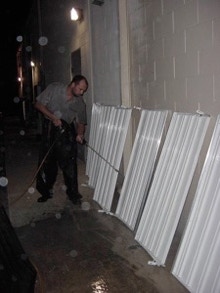Bottom wire racks and pans are removed from each case for pressure washing. All wire racks and bottom pans are reinstalled in the cases after cleaning. →